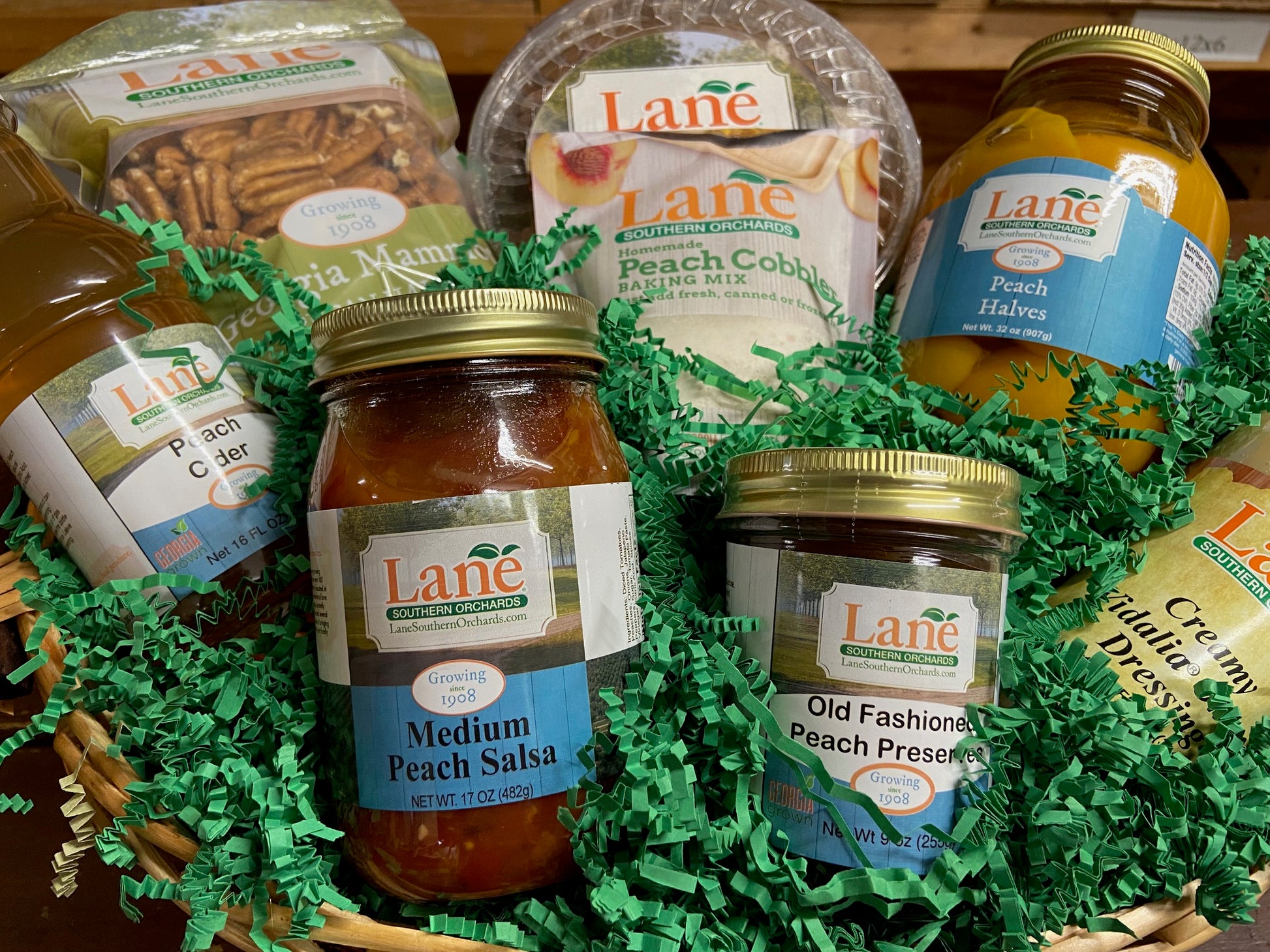 Send them a taste of home with this gift basket full of Georgia goodies! Peach Salsa, Dessert Peach Halves, Peach Cobbler Mix, Pecan Halves, Peach Preserves, Southern Pecan Sampler, Creamy Vidalia Onion Dressing and Peach Cider. They will taste Georgia in every bite!